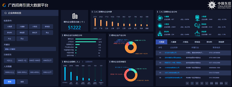 广西招商引资大数据平台是中国东信自主研发的智慧招商大数据平台。该平台于2019年8日底由中国东信成功中标并开展建设,2019年12月完成项目整体工作并投入使用。平台为自治区投促局提供了六大核心产业的全产业链分析,精选超过5万家候选靶向企业,构建了『数据寻商、线上触达、人工联系』和『主动推送、线上浏览、意向登记、人工接洽』的线上双向数据闭环,推动招商引资智慧升级。