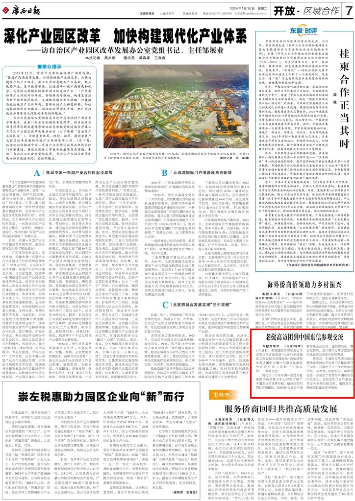 摘要:转自广西日报 2024-01-30 007版新闻 1月25日,老挝国家信用信息公司首席执行官琅淞诺·文康与老挝国家工商会副主席谭纳松·波纳玛特率高访团到中国—东盟信息港股份有限公司(简称“中国东信”)参观交流。