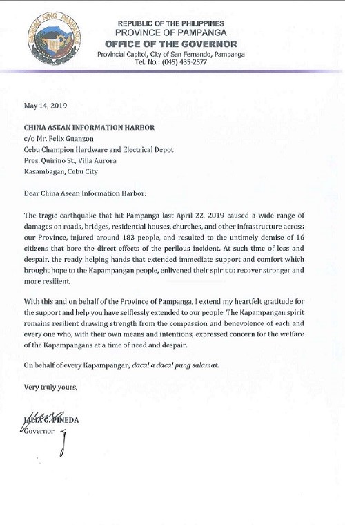 目前,此笔捐款已汇入邦板牙省的捐款账户。该省省长Lilia G. Pineda女士发来感谢信,对中国东信慷慨及时的援助与无私支持表示衷心感谢。中国东信将继续携手菲律宾合作伙伴,共同推动数字经济合作。